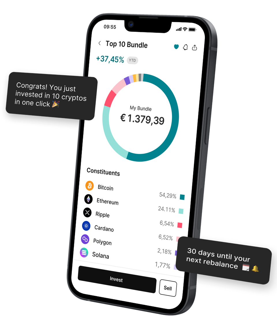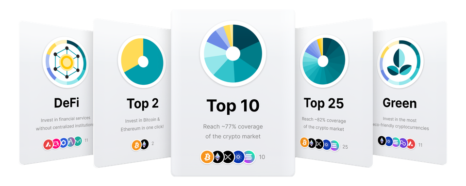 Met slechts één klik kun je investeren in een combinatie aan cryptos, gewogen naar marktkapitalisatie of in een specifieke sector. Net als de profs.
