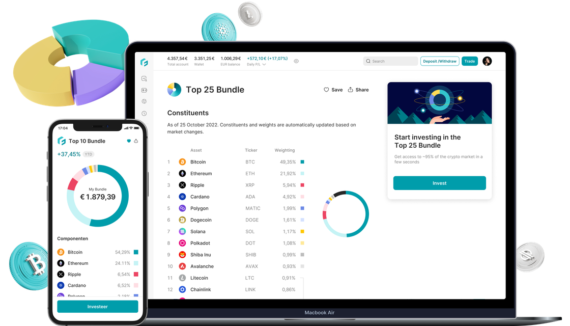 Com apenas um clique, pode investir numa combinação das maiores criptomoedas por capitalização de mercado, ou em setores específicos. Tal como os profissionais.